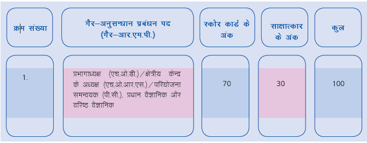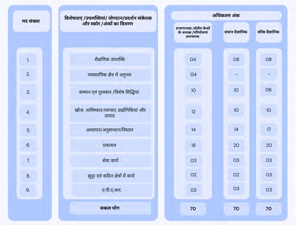 प्रभागाध्यक्ष (एच.ओ.डी.)/क्षेत्रीय केन्द्रों के अध्यक्ष (एच.ओ.आर.एस.)/परियोजना समन्वयक (पी.सी.)/प्रधान वैज्ञानिक और वरिष्ठ वैज्ञानिक पदों के लिए स्कोर कार्ड का विवरण:-
