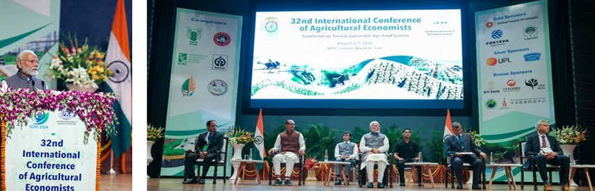 (क) “32वां त्रैवार्षिक अंतरराष्ट्रीय कृषि अर्थशास्त्री सम्मेलन (आईसीएई)” 02 से 07 अगस्त, 2024 तक अंतरराष्ट्रीय कृषि अर्थशास्त्री संघ(आईएएई) द्वारा एनएएससी कॉम्प्लेक्स, नई दिल्ली में आयोजित किया गया। इस कार्यक्रम का उद्घाटन माननीय प्रधानमंत्री श्री नरेन्द्र मोदी जी ने किया। इस अवसर पर केन्द्रीय कृषि एवं किसान कल्याण मंत्री श्री शिवराज सिंह चौहान, नीति आयोग के सदस्य प्रोफेसर रमेश चंद, सम्मेलन के अध्यक्ष प्रोफेसर मतिन काइम और डेयर के सचिव एवं आईसीएआर के महानिदेशक डॉ. हिमांशु पाठक उपस्थित थे। इस वर्ष सम्मेलन का विषय था “टिकाऊ कृषि खाद्य प्रणालियों की ओर रूख”। इसका उद्देश्य जलवायु परिवर्तन, प्राकृतिक संसाधनों का क्षरण, बढ़ती उत्पादन लागत और विवाद जैसी वैश्विक चुनौतियों के मद्देनजर टिकाऊ कृषि की महती आवश्यकता पर ध्यान देना था। सम्मेलन में लगभग 75 देशों के 1,000 प्रतिनिधियों ने भाग लिया।